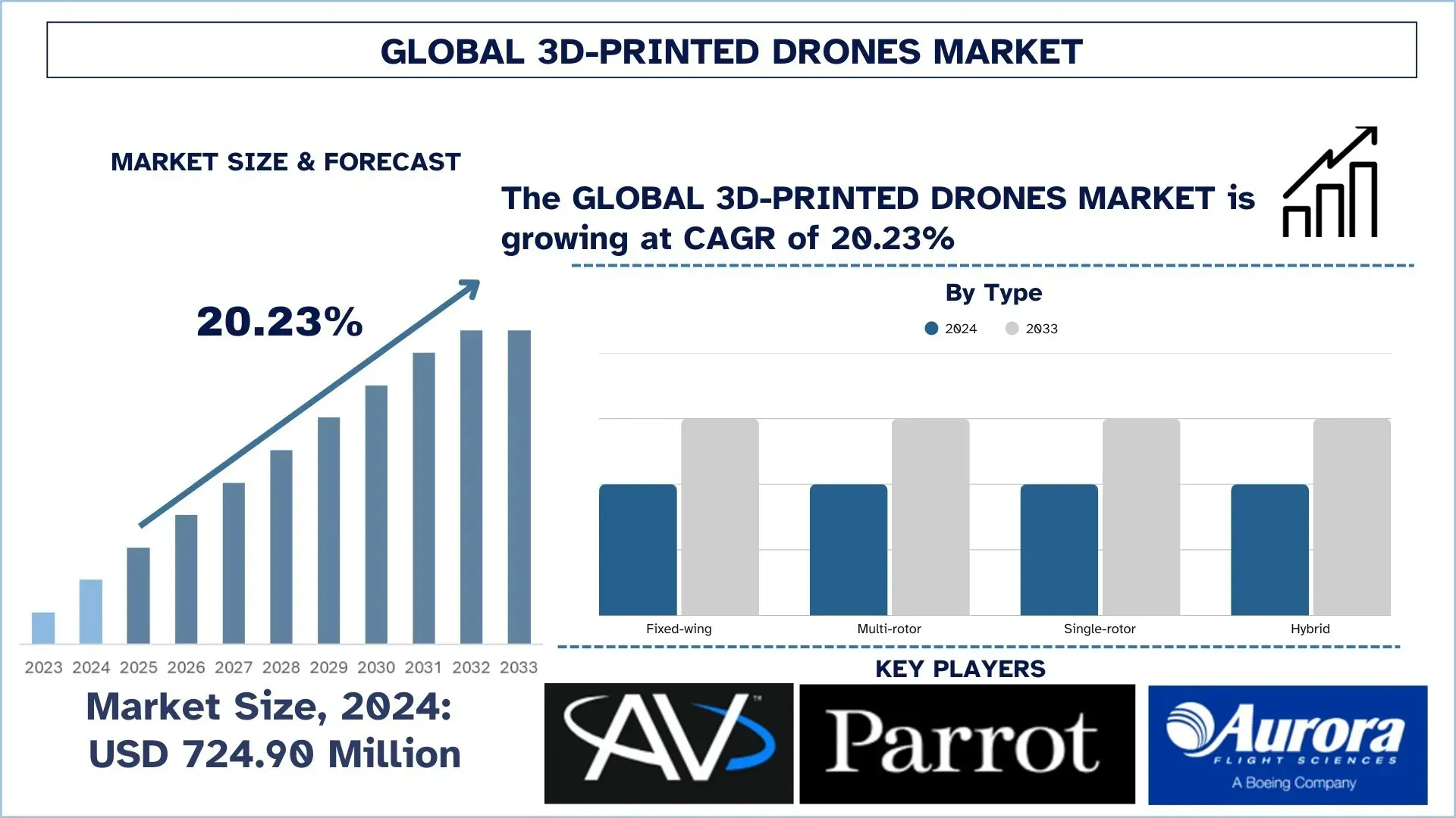 According to the UnivDatos, as per their “3D-Printed Drones Market” report, the global Market was valued at USD 724.90 million in 2024, growing at a CAGR of about 20.23% during the forecast period from 2025 - 2033 to reach USD million by 2033.
