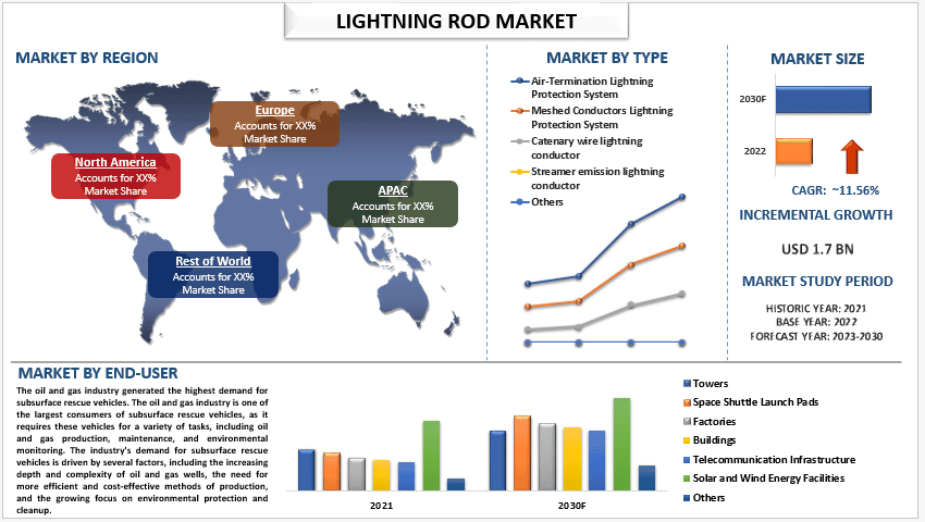 According to the UnivDatos, the surge in the investments related to renewable energy infrastructure development will drive the scenario of the lightning rods and as per their “Lightning Rod Market” report, the Market was valued at USD 1,700 Million in 2022 and expected to grow at a CAGR of 11.56% during the forecast period from 2023 - 2030 to reach USD Million by 2030.