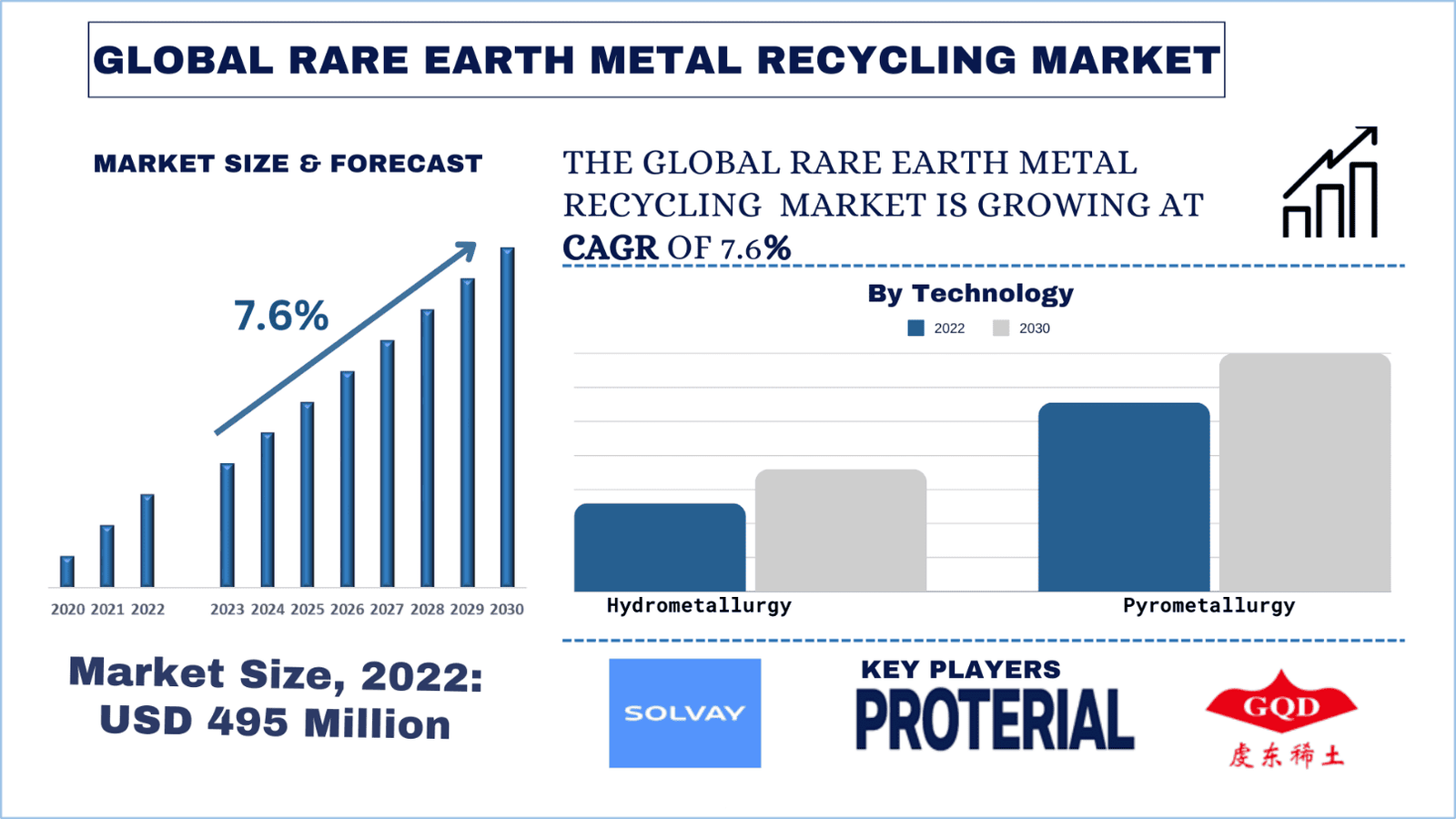 The Rare Earth Metal Recycling Market was valued at 495 million in 2022 and is expected to grow at a steady rate of around 7.6 % in the forecasted period (2023-2030).