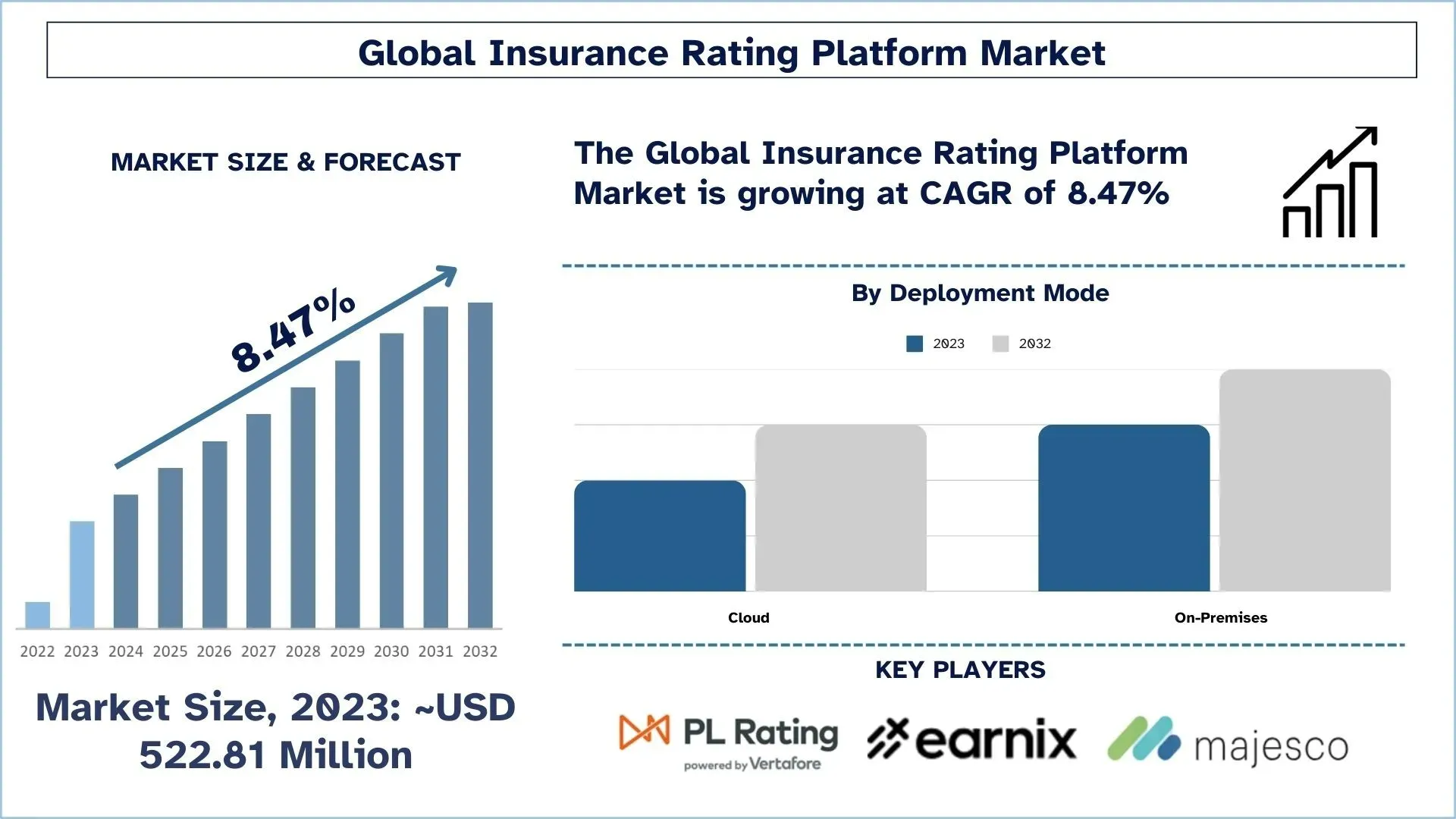 According to the UnivDatos, the Insurance Rating Platform Market was valued at USD Million in 2023, growing at a CAGR of 8.47% during the forecast period from 2024 - 2032 to reach USD 1085.6 Million by 2032.