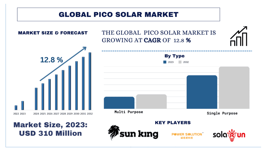 According to the UnivDatos, the Growing advancement in solar technology, including improvements in efficiency and affordability would massively transform the global scenario of Pico solar and as per their “Pico Solar Market” report, the global Market was valued at USD 310 Million in 2023, growing at CAGR of 12.8 % during the forecast period from 2024 - 2032 to reach USD Million by 2032.